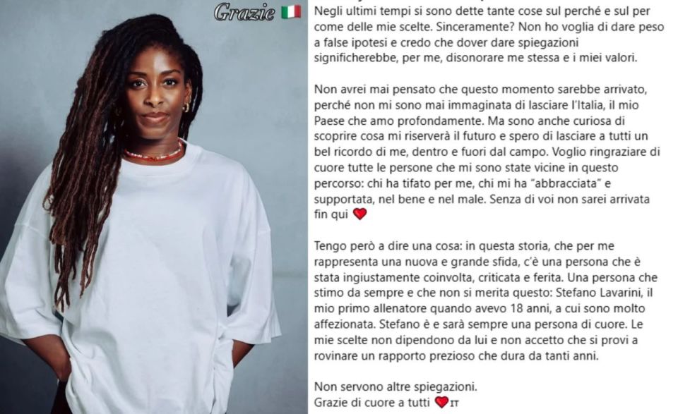 新赛季加盟土耳其豪门加拉塔萨雷的意大利女排名将米里亚姆·塞拉(Miriam Sylla),在转会消息公布后开始遭遇了不少球迷的质疑和网暴,面对外界声音,她选择在个人社交媒体上亲自发声,用一段真挚的长文回应所有质疑。